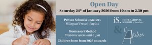 Bilingual Montessori workshops "L'Atelier" every mornings. For children from 2 years old. For more information, please see below.